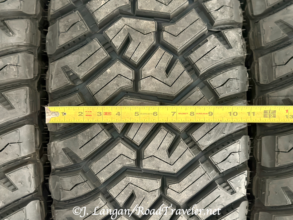 Tesche’s brochure offers dozens of X/RT sizes for wheels from 15 inches all the way up to 28 inches in diameter. The majority are for the most popular 17-inch, 18-inch, and 20-inch sizes, and all are listed as having 18/32-inch of tread (keep reading). From the limited options available from the initial shipping containers hitting the Southern California docks in early 2025, I chose the 35X12.50R20LT for this evaluation.