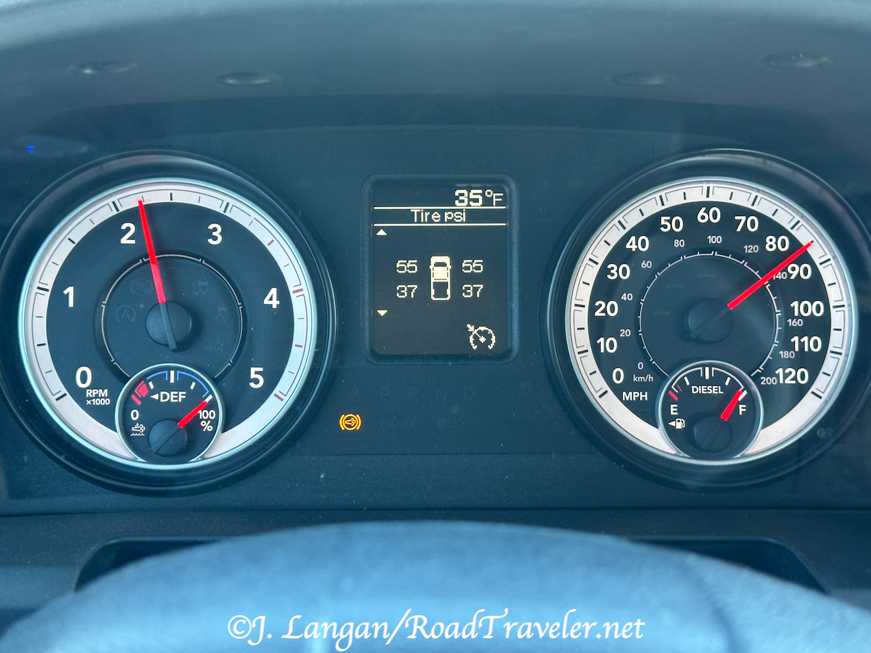 The 67-pound X/RT tires were mounted on 40-pound OEM aluminum Ram 20″ wheels. All four required minimal weight to balance, the most being just 5.25 ounces. The average for all four 107-pound assemblies was 4.4 ounces; impressive! This caused me to question if the technician had balanced them properly, but my concern disappeared after rolling down the highway at speed.